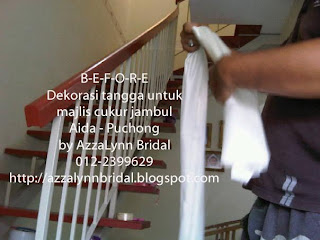 ecelli kain ni tersangatlah tak cukup nyer tapi terpaksa jadikan cukup. bole la tuh. kalau korang nak buat hiasan tangga dengan hasil yg lebih baik, utk tangga saiz gini korang kena guna kain 8-10 meter penuh dgn bidang 45-60. kalau beli 4 meter tapi bidang 45 then korang belah dua pulak utk jadikan 8 meter, hasilnya so-so jer la... aku rekemen kat korang gunakan kain lembut jenis JC/jersey utk scallop part... utk balutan pemegang tu aku suka guna satin atau net.. coz kalau guna JC/jersey tak lawa. berpeluh2 la melayan utk memastikan segala ketidak cukupan itu menjadi sempurna.... Alhamdulillah aku boleh mengatasi masalah tu.... flower ball lak terlalu sedikit... at least 4 ketul dah boleh beri hasil yg cun. masalahnya, aku tak boleh capture gambar berwarna ungu dengan sempurna....camner ek... any colors with ungu will looks totally different in real life and in photo. yg ni aku capture guna BB jer coz D80 aku tertinggal kat umah ibu manakala digicam abih bateri pulak